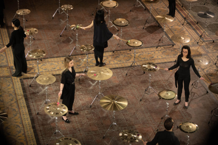 Páteční koncert, který proběhl ve výstavní síni Gropius Bau, už svým názvem 100 Cymbals napovídal, že ústřední úlohu zde budou hrát perkusní nástroje. Uprostřed prostorného obdélníkového hlavního sálu galerie bylo rozestaveno ve tvaru čtverce sto činelů různých velikostí a publikum bylo usazené po obou stranách této geometrické expozice. Na programu byla Cageova skladba uváděná ve zkráceném názvu But what about the noise of crumpling paper… a dílo 100 Cymbals japonského skladatele a vizuálního umělce Ryojiho Ikedy z roku 2019.